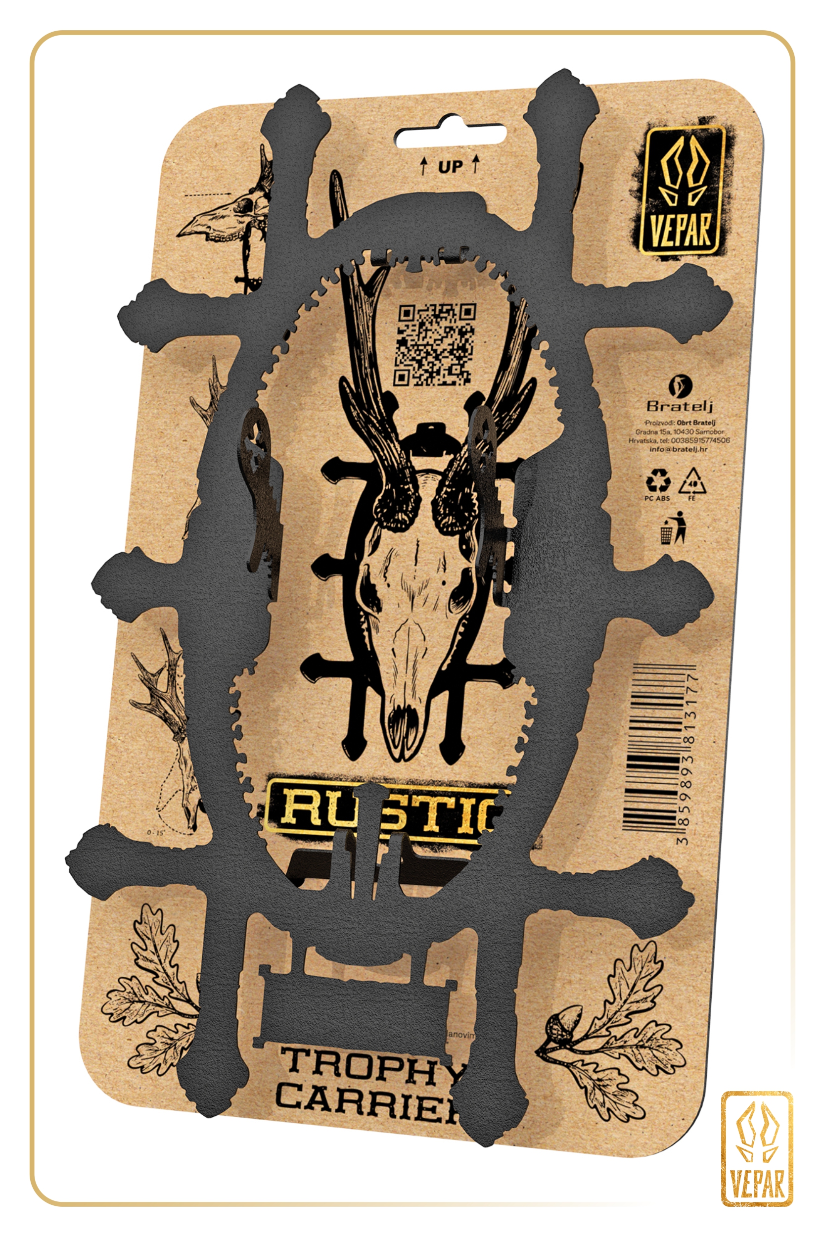 Trophy Carrier Rustic omogućuje stabilno i uravnoteženo postavljanje srnećeg trofeja, uz dugoročnu sigurnost u prostoru, s mogućnošću personalizacije.